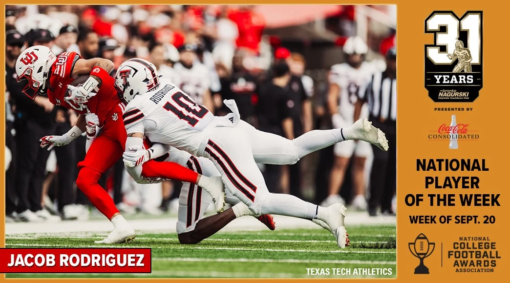 DALLAS (FWAA) – Texas Tech linebacker Jacob Rodriguez had a hand in two turnovers Saturday to go with a team-leading 11 tackles as the Red Raiders more than contained then-No. 16 Utah in a statement 34-10 road win. For his game-changing plays and defensive leadership in Texas Tech’s Big 12 Conference opener, Rodriguez has earned the Bronko Nagurski National Defensive Player of the Week for the weekend of Sept. 20 by the Football Writers Association of America.